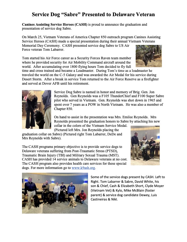 I was in the United States Air Force. I worked in Airfield Management. I maintained the airfield and filed flight plan’s. My rank was A1C. I was medically discharged. Cash was issued to me 9/2018. He is my lifeline every day. We have had a special bond since we met. CASH was a DVMA Hero Animal this year.